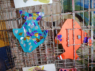 We read the book “Swimmy,” in which a group of small fish swim together as one big fish. After, we made swimmy collages.