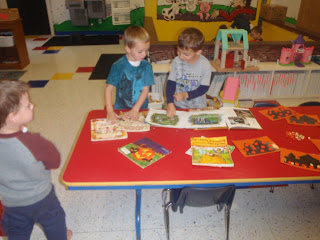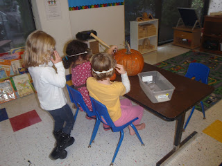 This center was a huge hit this week. The Robins used a hammer to pound/remove nails from a pumpkin. This activity was a great way for us to practice taking turns, following safety rules (All children at this center were asked to wear safety goggles), motor skills, and hand-eye coordination.